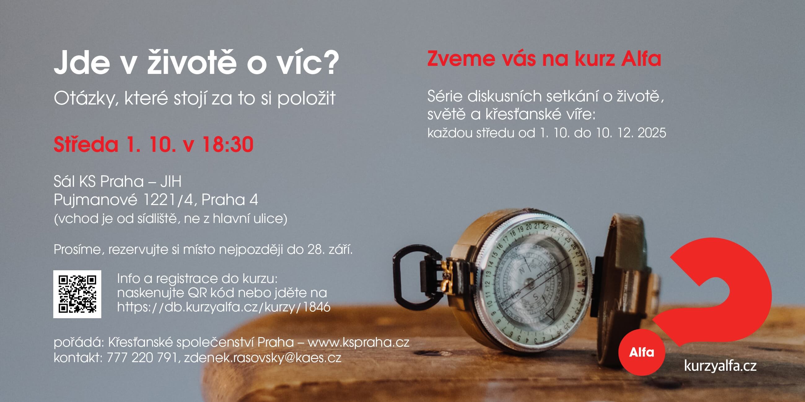 Kurzy Alfa představují jedinečnou příležitost prozkoumat otázky smyslu života a křesťanské víry. Na podzim 2025 proběhnou také na Pankráci. První setkání se bude konat 1. října 2025. Kurz je zdarma, ale na místě možné dobrovolně přispět na náklady. Kvůli jídlu je potřeba se na kurz přihlásit. Přihlašování je možné na odkazu zde nebo použitím QR kódu v pozvánce.